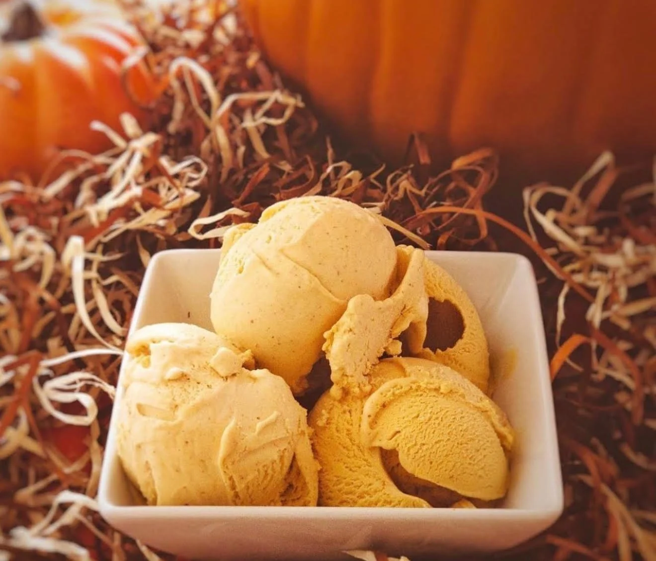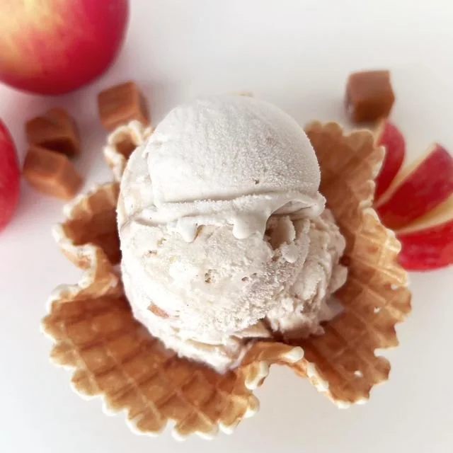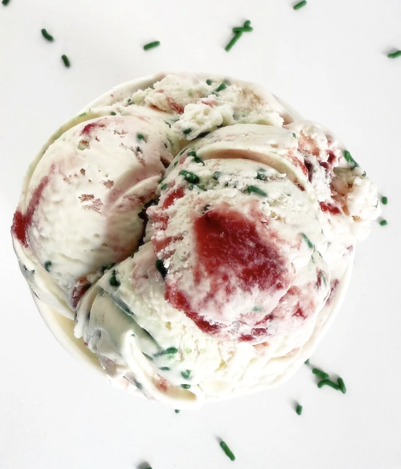 Vanilla ice cream with strawberry swirl and green sprinkles